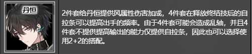 2件套给丹恒提供风属性伤害加成,4件套在释放终结技后的自拉条可以提高出手的频率。由于4件套可能会造成乱轴,并且4件套不提供提高输出的能力仅提供自拉条,因此也可以选择使用2+2的搭配。