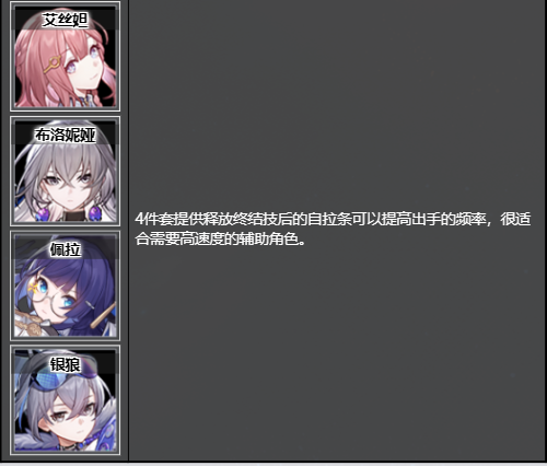 4件套提供释放终结技后的自拉条可以提高出手的频率,很适合需要高速度的辅助角色。
