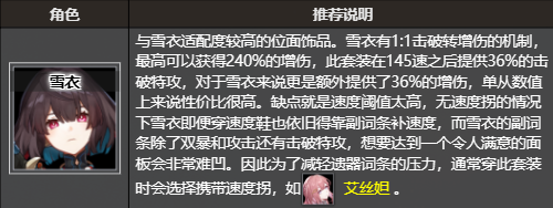 与雪衣适配度较高的位面饰品。雪衣有1:1击破转增伤的机制,最高可以获得240%的增伤,此套装在145速之后提供36%的击破特攻,对于雪衣来说更是额外提供了36%的增伤,单从数值上来说性价比很高。缺点就是速度阈值太高,无速度拐的情况下雪衣即便穿速度鞋也依旧得靠副词条补速度,而雪衣的副词条除了双暴和攻击还有击破特攻,想要达到一个令人满意的面板会非常难凹。因此为了减轻遗器词条的压力,通常穿此套装时会选择携带速度拐,如艾丝妲。