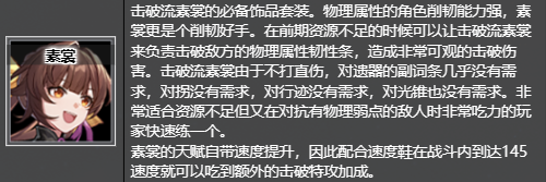 击破流素裳的必备饰品套装。物理属性的角色削韧能力强,素裳更是个削韧好手。在前期资源不足的时候可以让击破流素裳来负责击破敌方的物理属性韧性条,造成非常可观的击破伤害。击破流素裳由于不打直伤,对遗器的副词条几乎没有需求,对拐没有需求,对行迹没有需求,对光锥也没有需求。非常适合资源不足但又在对抗有物理弱点的敌人时非常吃力的玩家快速练一个。