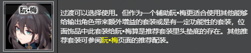 过渡可以选择使用。但作为一个辅助阮•梅更适合使用其他能够给输出角色带来额外增益的套装或是有一定功能性的套装,位面饰品中此套装给阮•梅算是推荐套装里头垫底的存在。其他推荐套装可参阅阮•梅页面的推荐配装。