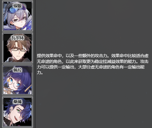提供效果命中,以及一些额外的攻击力。效果命中比较适合虚无命途的角色,以此来获取更为稳定挂减益效果的能力。攻击力可以提供一定输出,大部分虚无命途的角色有一定输出能力。