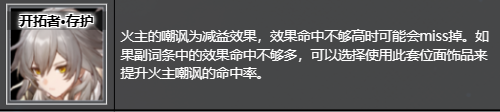 火主的嘲讽为减益效果,效果命中不够高时可能会miss掉。如果副词条中的效果命中不够多,可以选择使用此套位面饰品来提升火主嘲讽的命中率。