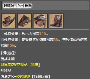 四件套效果:使装备者的速度提高6%,普攻造成的伤害是高10%。