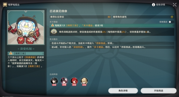解析:战斗模式为虚构叙事类模式,但是这关精英怪较多,生存压力不小,罗刹属于必带角色。在异变机制的帮助下,我们需要手动调整电视机的表情,灵活运用队伍中,扩散、单攻、群攻多种类型的技能,尽量多的完成三消,自动是个笨蛋。