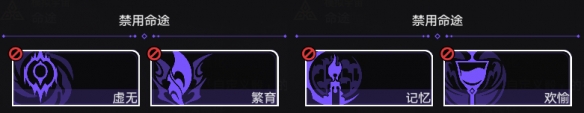 1、禁用命途推荐:虚无、繁育、记忆、欢愉四选一。命途禁用方面没有固定标准,根据自身出战队伍的不同,可自行决定禁用哪些命途。