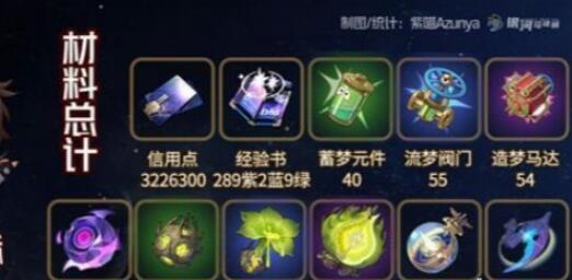 信用点*225300、经验书85紫1蓝4绿、蓄梦元件*12、流梦阀门*13、忿火之心*7;