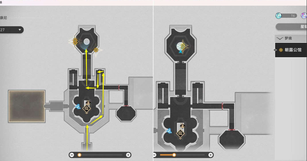 (1)切换黄泉视角,和瓦尔特一起进入朝露公馆,接着去下图位置过剧情即可完成。