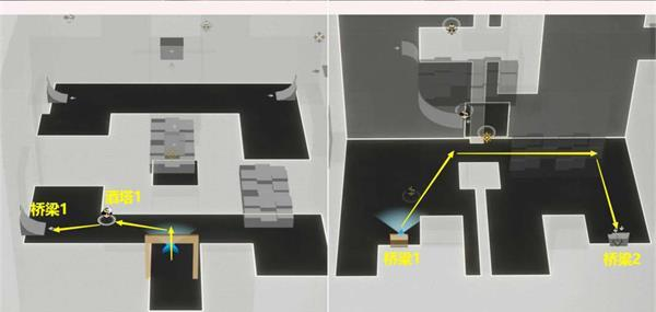 5. 进入房间1后,首先在左侧的酒塔1处完成相应动作获取次数,紧接着通过桥梁1上行,再经由右侧桥梁2下行。
