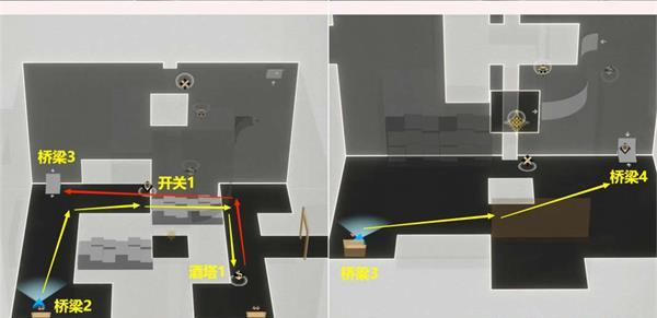 6. 接下来,先行启动开关1,回到酒塔1获取次数后,沿桥梁3上行,然后从右上角的桥梁4继续攀爬向上。