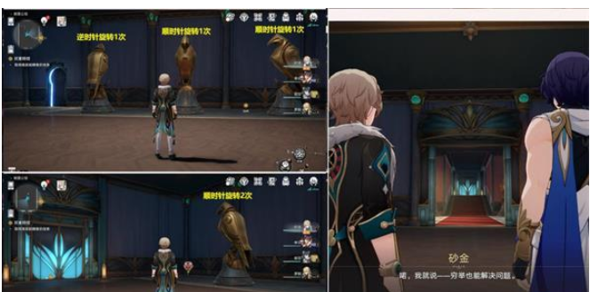 2.从上图门进来后,将下图位置4个雕像正确旋转后,隐藏的正确门就会出现,然后继续任务走。