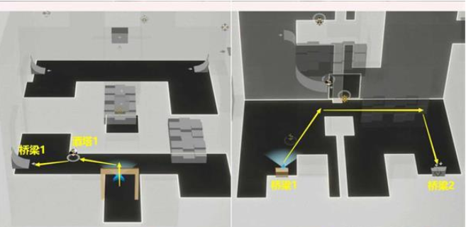5.进入上图【房间1】后,左边【酒塔1】获得次数后,从【桥梁1】上去,接着从右边【桥梁2】下去。