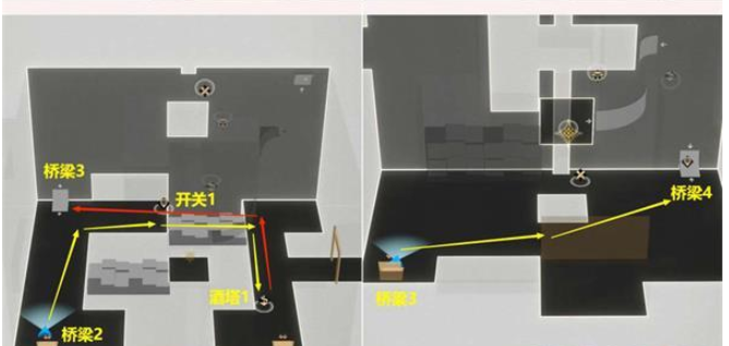 6.然后先去打开【开关1】,去【酒塔1】获得次数后,再从【桥梁3】上去,接着从右上角【桥梁4】上去。