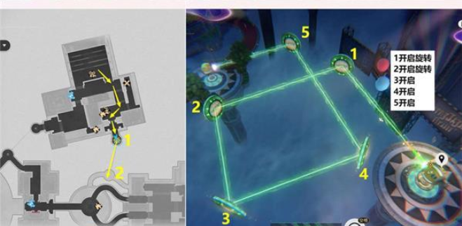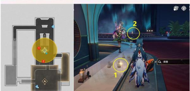 1.上图过完剧情后,会自动传送到下图位置,先去1和2位置收集材料。