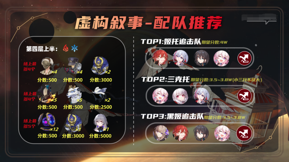 三层与四层的下半都是雷属性弱点拉满的环境,受本期虚构buff影响,最优先推荐的是景托(注意不是景元单C,景元追加攻击的频率会跟不上),其次是黑卡DOT队(三层下全零星魂低练度也很容易拿满分,但是四层下有一定的练度才会好打,这其中部分原因是无风弱点);至于黄泉主C队:只有零星魂时,建议舍弃生存,队友带两名虚无、一名同谐角色才更能保证取得高分;