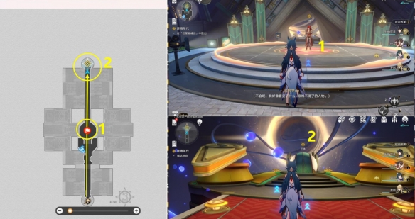 2、上图会传送到下图位置,先去1任务打完银枝,再去2任务点传送,这里顺便说一个2选1成就,在1任务点如果你打败银枝,会获得成就《终结技是永远的真诚》,如果你能说服银枝,则会获得成就《真诚是永远的终结技》,属于【通往群星的轨道】