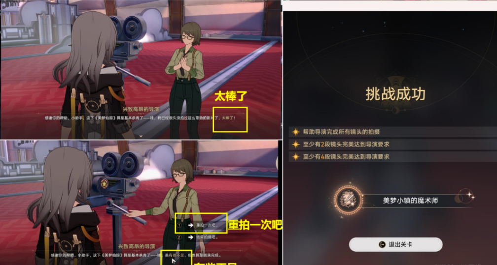 8、因为在前面5次拍照过程中,有些怪是来回走动的,所以要等全部怪都进入镜头后再完成拍照,如果5次拍照都将全部怪拍到,最后导演会说【太棒了!】,则完成副本后,即可获得隐藏成就《美梦小镇的魔术师》,如果导演最后说的是【有些不足】,那就选择【重拍一次吧】,如果还不能拿到成就,就重新进副本再完成5次拍照来拿成就。
