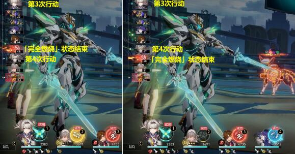然后等流萤第3次行动时(第3次释放E技能时),再次先释放同协主的大招给流萤第2次增加一次速度后,就能将流萤第4次行动提前到「完全燃烧」状态结束前,这样利用同协主大招给流萤增加2次速度后,就能实现在「完全燃烧」状态结束前,流萤行动4次,释放4次【火萤Ⅳ型-死星过载】(E技能)了,正常不给流萤加速的情况下,流萤在「完全燃烧」状态结束前,只能释放3次【火萤Ⅳ型-死星过载】(E技能);
