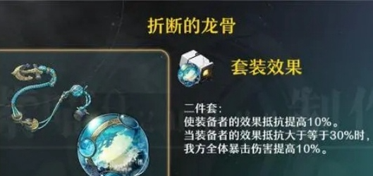 1、二件套效果:提升装备者10%的效果抵抗,还可以提升我方全体的暴击伤害。