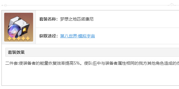 使装备者的能最恢复效率提高5%,使队伍中与装备者届性相同的我方其他角色造成的伤害提高10%。