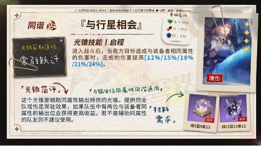 该光锥提供增伤,不过限定在必须和装备者同个属性,对花火来说就是全队量子属性增伤。在辅助量子属性输出时会比较好用,但非量子属性输出就等于没用了。所以这个光锥可以作为量子队中花火的备选光锥。