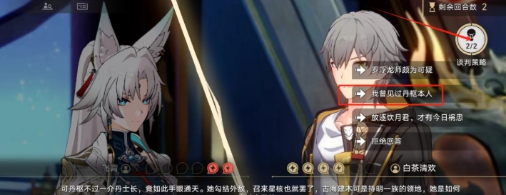 第二回合:选择【我曾见过丹恒本人】,可以先选择谈判策略里面【情绪调动】再做选择即可直接谈判成功。