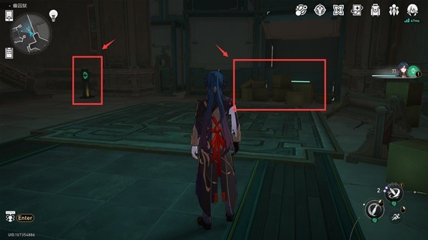 按路径上来之后,会看到集装箱前边有几个快递箱,然后往左走,这个交互如果是黄的,点一下变成绿的就行。然后上坡。