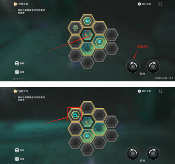 2、先点击如图所示的轮盘,将红色圆圈切换成转盘,点击左旋3次,将“5”对齐;