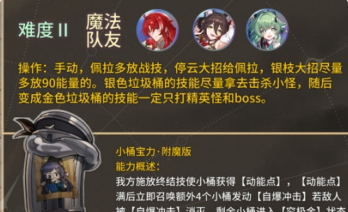 2、具体操作:手动战斗,多使用佩拉的战技,停云大招给佩拉,优先使用银色垃圾桶的技能击杀小怪,用金色垃圾桶的技能攻击精英怪和boss。