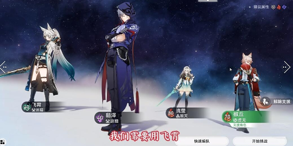 2、接着进入一处挑战,使用飞霄、椒丘、貊泽组队,如果角色不够可以在支援列表中借用