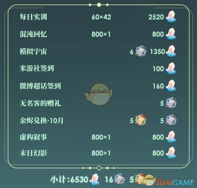小月卡:约18730星琼+16星轨通票(约117抽+16星轨通票)