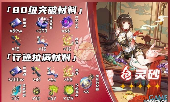 在崩坏星穹铁道2.5版本下半期卡池中即将上线角色灵砂,这个是火属性的角色,相当于加拉赫的上位。有不少小伙伴都想要抽取和养成,下面小编为大家整理了灵砂升级突破、解锁行迹需要消耗的材料,玩家们可以对照攻略来提前进行收集筹备,便于角色上线后进一步进行养成。