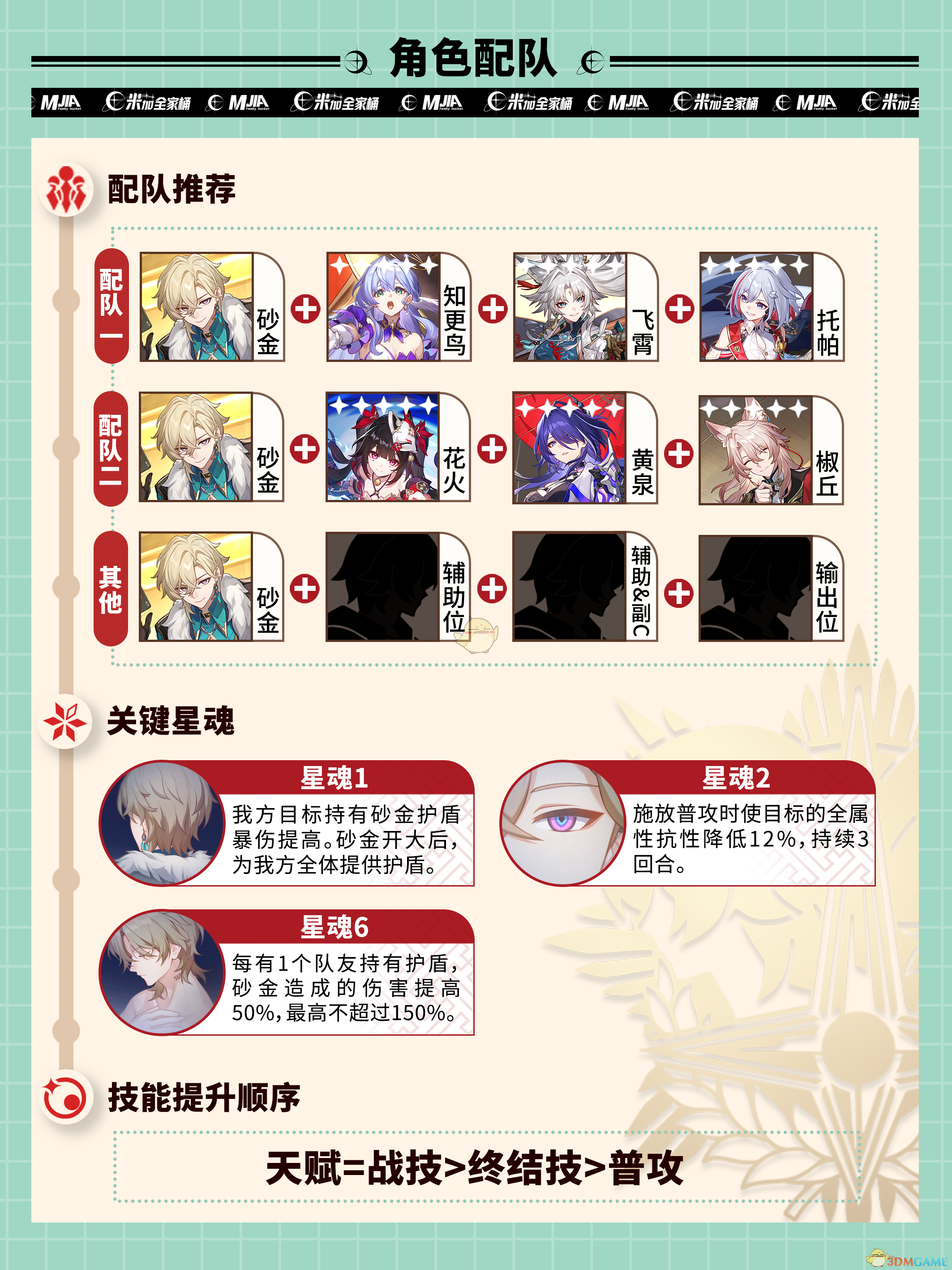 三、砂金作为万金油角色,无论是进追击队还是其他队伍单纯做一个生存辅助位,都可以完美胜任,技能加点天赋=战技>终结技,普攻可以不点;