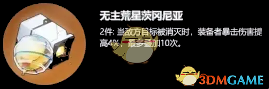 1、二件套效果:使装备者的暴击率提高4%。当敌方目标被消灭时,装备者暴击伤害提高4%,最多叠加10层。