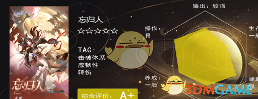 3、忘归人是一名辅助型角色,可以使单体无视敌方属性削韧,提高弱点击破效率、恢复能量;