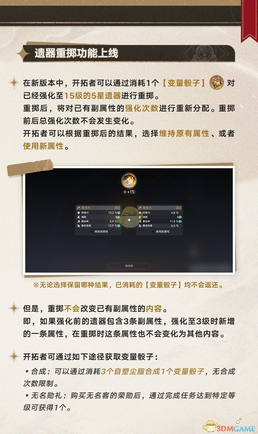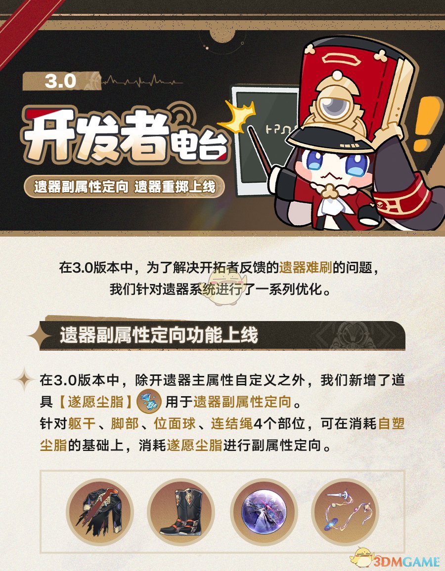 本期包含了将在3.0版本上线的遗器副属性定向、遗器重掷等功能的介绍哦~