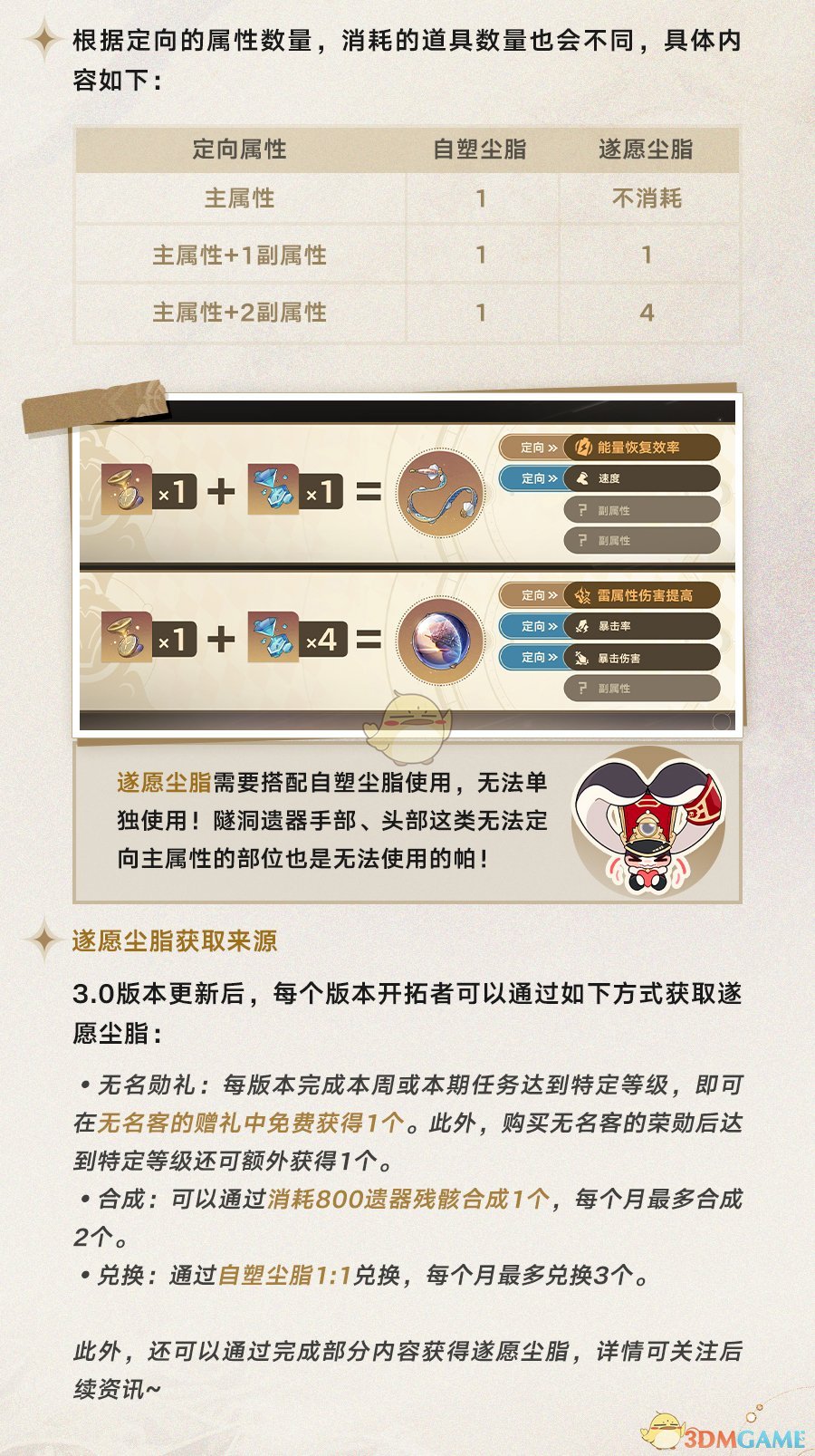 帕姆的小提示:使用自塑尘脂与遂愿尘脂定向合成遗器时,遗器出现3或4条副属性的概率与目前定向遗器时一致帕。
