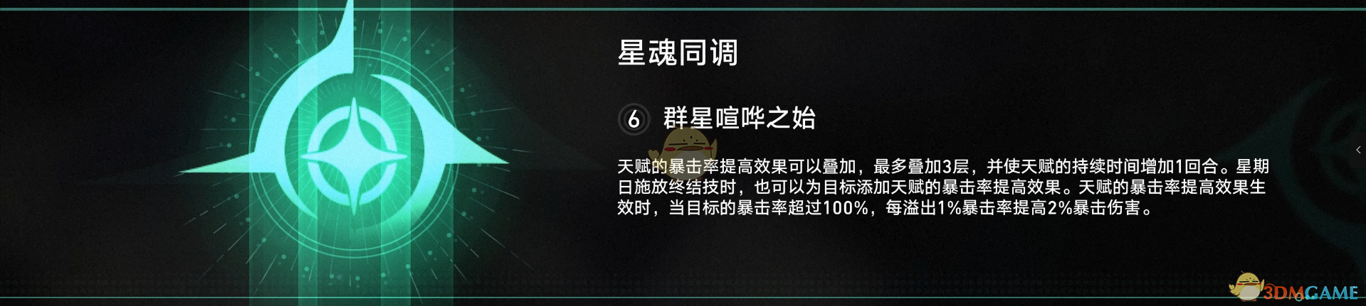 4、6魂:天赋的暴击效果可叠加3层,即提供上限60%的暴击收益,同时持续时间延长至4回合,且对终结技增益目标也能添加天赋的暴击加成;若目标当前暴击超过100%,则按1:2转换为暴伤收益,双暴的提升为主c带来充足稳定的出伤表现;