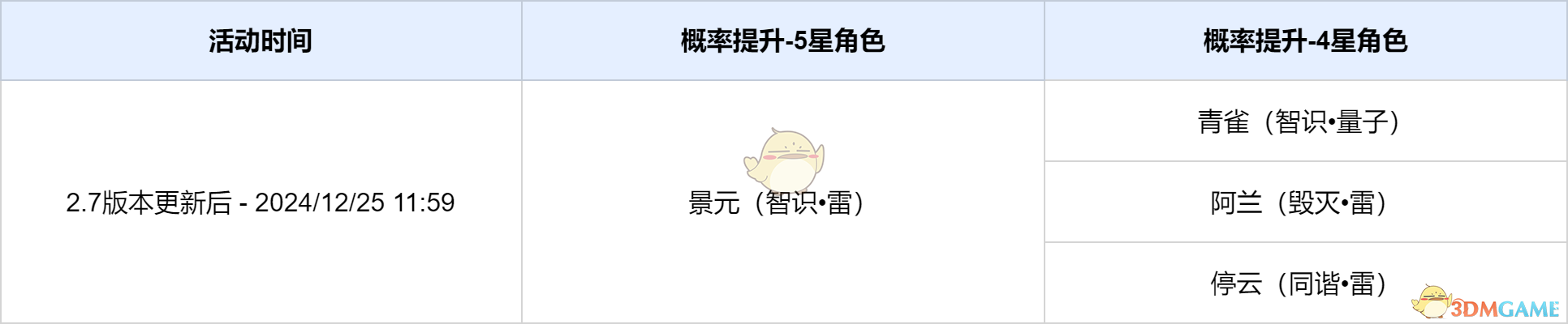 活动期间,限定5星角色景元(智识-雷),4星角色青雀(智识-量子)阿兰(毁灭-雷)停云(同谐-雷)跃迁成功概率限时提升。