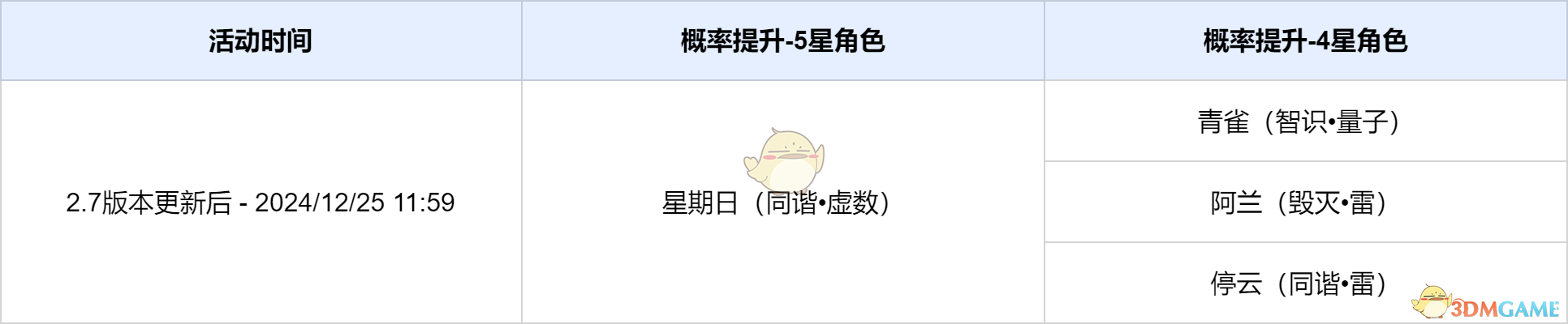 活动期间,限定5星角色星期日(同谐-虚数),4星角色青雀(智识-量子)、阿兰(毁灭-雷)、停云(同谐-雷)跃迁成功概率限时提升。