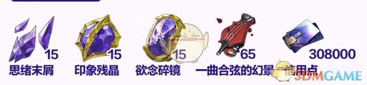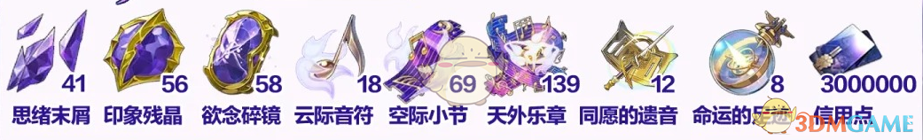 思绪末屑*15、印象残晶*15、欲念碎镜*15、一曲合弦的幻景*65、信用点*30.8w