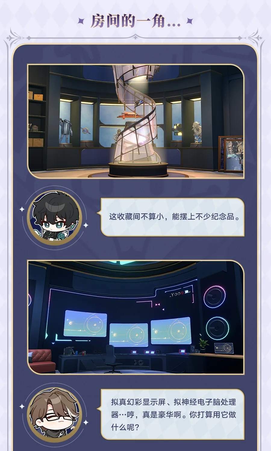 在「星穹列车」的「派对车厢」二楼,开拓者拥有一间自己的房间,房间共有6个区域,每个区域都有独立的建造进度。