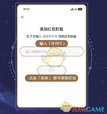 3、然后在添加红包封面中,点击输入序列号,继续点击添加;