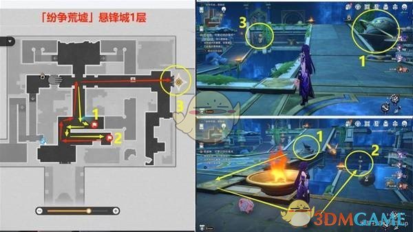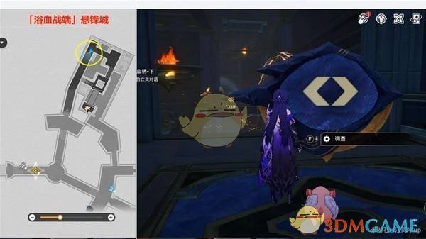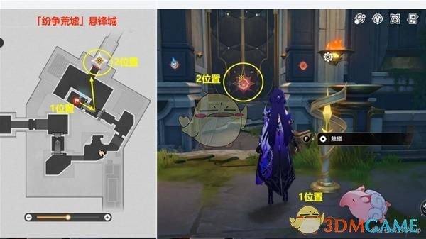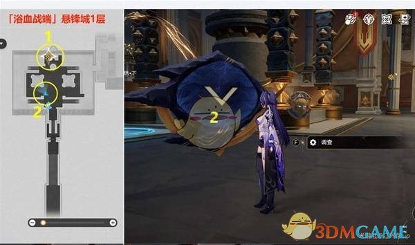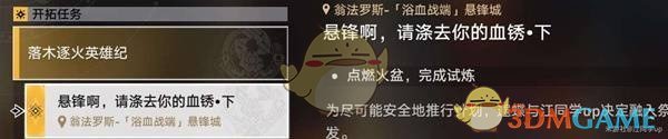 任务进行到【悬锋啊,请涤去你的血锈·下--点燃火盆,完成试炼】时,首先追踪任务指示前往2号位置完成解密,完成后,1号位置的火盆将会被点燃。