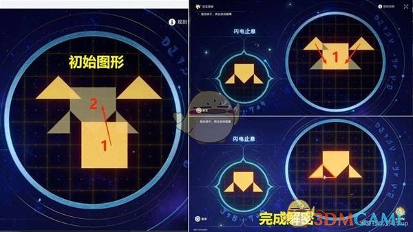 接着,将上方的两个小黄色三角形交叉移动到2号和4号位置的上方,完成解密。
