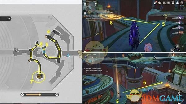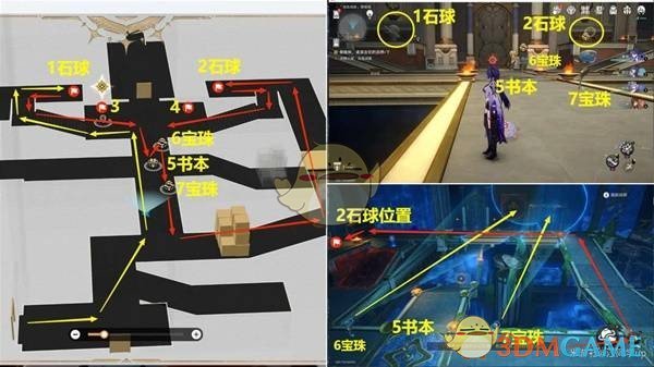 接下来,前往下方2层的4号石球位置,将其左侧的6号基座打碎,使得上面的石球滚到1层的7号位置。