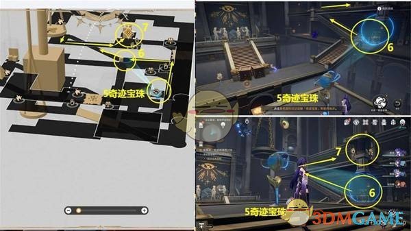 开启上图位置的【5号奇迹宝珠】后,将其照射到右侧的6号位置,这样就能从6号位置上去,前往楼上的7号任务点。