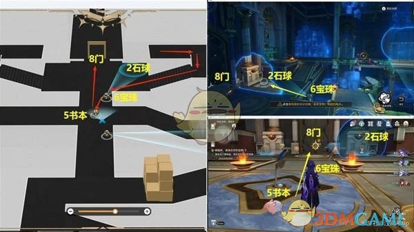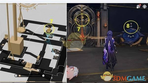 接着,将6号和7号奇迹宝珠的灯光旋转到右上角位置,这样就能到达2号石球位置。