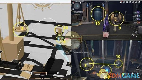 接着,开启7号位置门口的9号机关手掌,然后将10号位置的砝码抓起并放到3号位置的天秤上,之后继续过剧情。