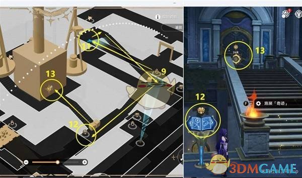 接下来,前往下图11号位置并完成剧情后,按照任务指引前往12号位置开启书本机关,之后即可前往13号任务点继续进行。